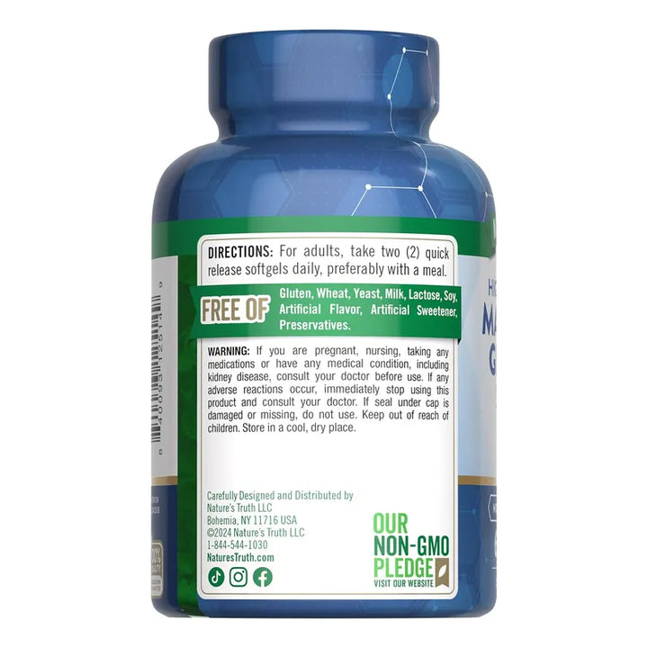 La calidad es nuestra prioridad. Por eso, las cápsulas son cuidadosamente formuladas sin OMG ni gluten, asegurando que cada dosis sea amable con tu cuerpo. No más preocupaciones sobre ingredientes no deseados. Además, Nature's Truth aplica su conocimiento generacional en cada cápsula, garantizando eficacia y pureza.