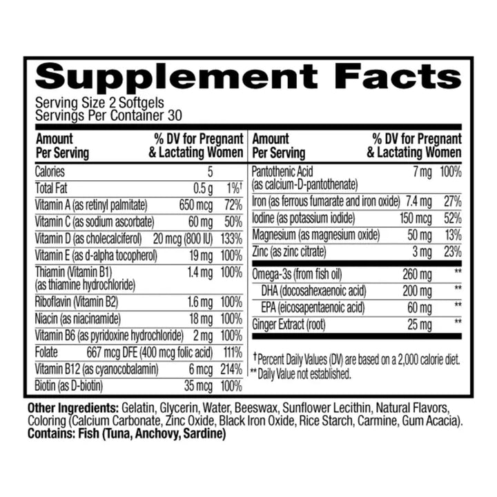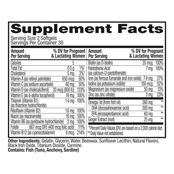 Durante el embarazo, cada nutriente que ingieres es vital para ti y tu bebé. Estas cápsulas blandas de ultra resistencia te proporcionan una mezcla nutritiva de ácido fólico, DHA, y vitaminas esenciales como la C y la E. Cada porción diaria te brinda los componentes cruciales para apoyar el crecimiento saludable y el desarrollo cerebral de tu bebé.