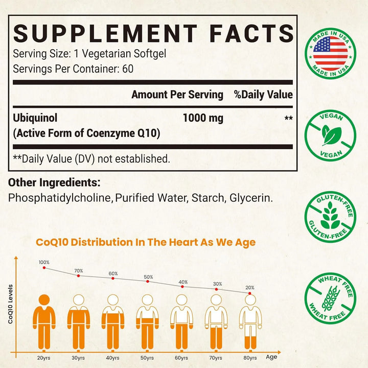 Cápsulas Blandas Ubiquinol CoQ10 1000 Mg Alta Absorción Vegano Corazón Energía