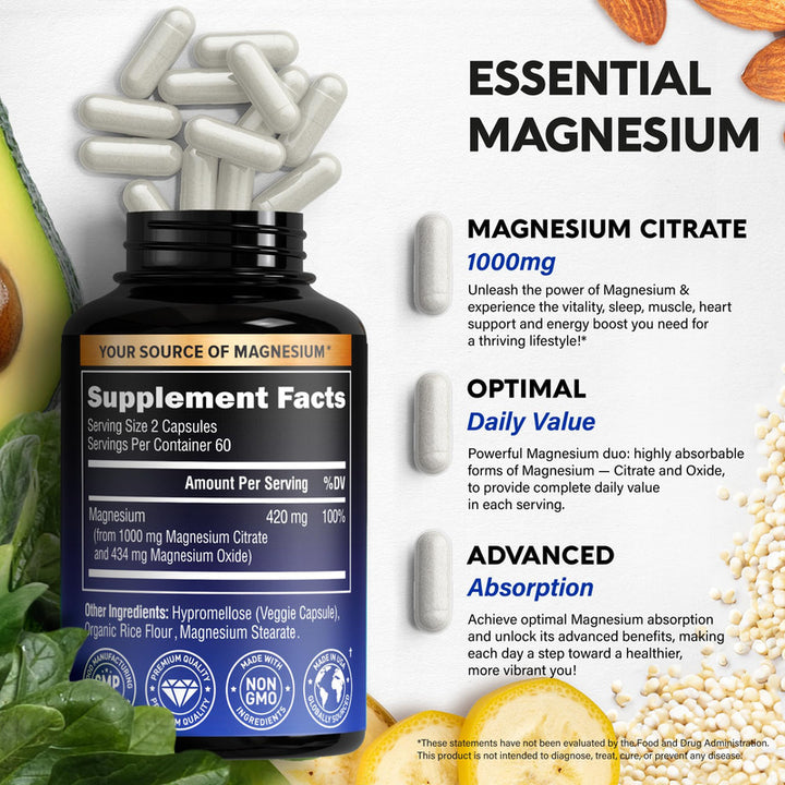Imagina disfrutar de noches de sueño reparador y despertar lleno de energía para enfrentar el día. ¿Qué pasaría si pudieras ayudar a tus músculos y corazón a rendir al máximo todos los días? Con nuestras cápsulas premium de citrato de magnesio de 1000 mg, esta visión puede ser tu realidad. 🛌💪