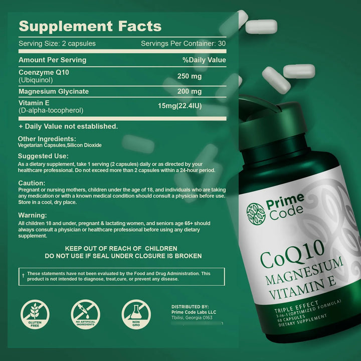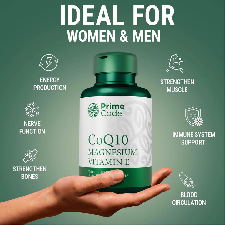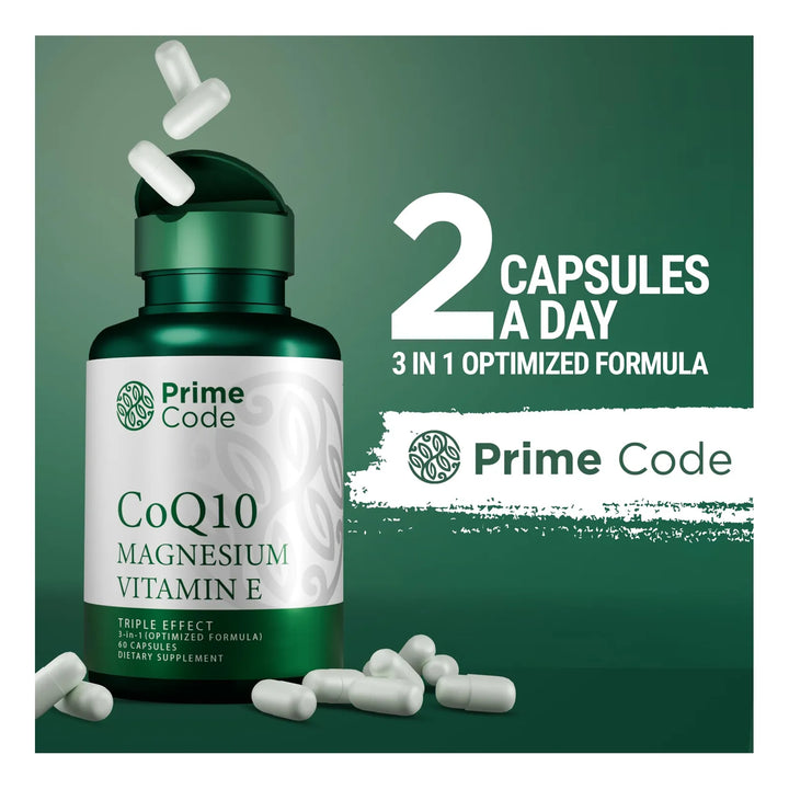 Este poderoso trío trabaja en sinergia para apoyar tu bienestar general. La CoQ10 es un nutriente esencial que tu cuerpo produce naturalmente, pero que disminuye con la edad. Al combinarla con magnesio y vitamina E, potencias sus beneficios, protegiendo tus células, mejorando tu energía y cuidando tu corazón como nunca antes.