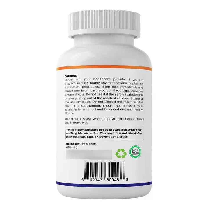 Imagina no tener que preocuparte por los efectos secundarios adversos gracias a nuestra formulación sin azúcar y libre de alérgenos como soja, levadura y maíz. Todo esto con el respaldo de los estrictos estándares GMP para asegurarte de que solo estás obteniendo lo mejor. 🏆