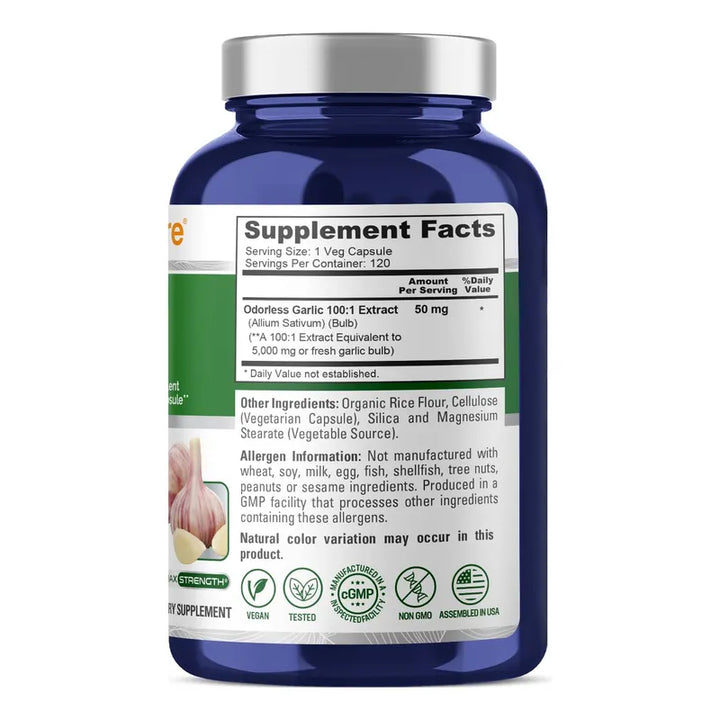 - 💊 Alta potencia y calidad, gracias al extracto 100:1 que proporciona 5,000 mg equivalentes de ajo fresco en cada cápsula.
