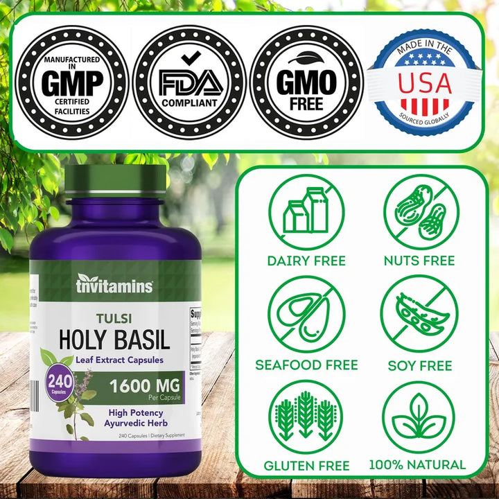 - 🌿 Extracto de Albahaca Sagrada Tulsi: Ingrediente altamente concentrado para máximos beneficios.