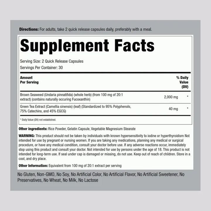 Las cápsulas no solo ofrecen el equivalente a 2000 mg de algas marrones por porción sino que están mejoradas con té verde, reconocido por su apoyo al metabolismo y a la gestión de peso. No tienes que preocuparte por sustancias no deseadas; este producto está completamente libre de OMG y gluten, asegurándote naturalidad y seguridad en cada dosis.