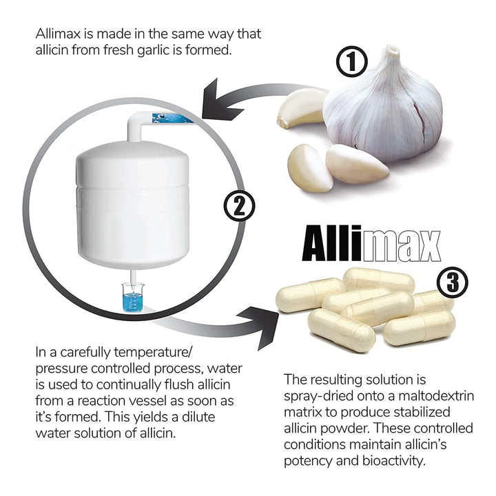 Cuando el ajo fresco se corta o tritura, se libera alicina, un compuesto con potentes beneficios. Nuestro proceso patentado estabiliza esta alicina, asegurando que llegue intacta a tu organismo. Al ingerirla, se absorbe rápidamente en el torrente sanguíneo, donde despliega sus propiedades de apoyo inmunológico y bienestar general.