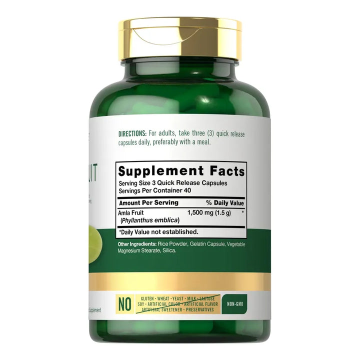 Nuestras cápsulas de Amla funcionan liberando 1500 mg de nutrientes poderosos por porción, permitiendo que tu cuerpo absorba fácilmente los beneficios de esta fruta tradicional. Con ingredientes de calidad superior y métodos de producción innovadores que preservan su potencia, cada cápsula está diseñada para maximizar tu bienestar.