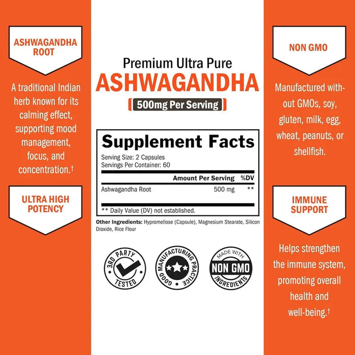 Hoy en día, todos enfrentamos desafíos que pueden afectar nuestro bienestar mental y físico. Estas cápsulas te ofrecen una solución milenaria que promueve un estado mental tranquilo y enfocado. Con cada porción, obtienes 500 mg de pura raíz de ashwagandha, un adaptógeno rejuvenecedor que ayuda a equilibrar tus niveles de energía y fomenta un sueño reparador.