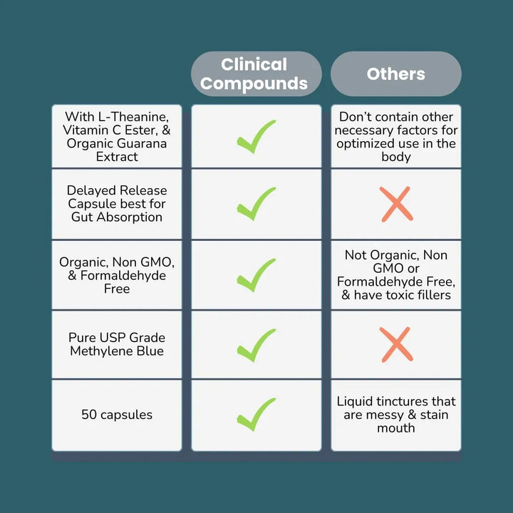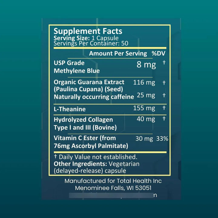 ¿Te has sentido agotado antes de terminar el día? ¿La niebla mental no te deja avanzar? Nuestro producto está diseñado para personas como tú, que buscan una solución real y efectiva. Con una fórmula única que combina Azul de Metileno USP, vitamina C, L-teanina y extracto de guaraná orgánico, cada cápsula es un paso hacia tu mejor versión.