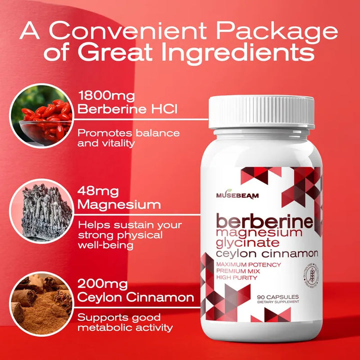 Nuestro trío de poderosos ingredientes activos te ofrece un apoyo comprobado y confiable para tu salud. Cada cápsula contiene 1800 mg de berberina HCl, 48 mg de magnesio, y 200 mg de canela de Ceilán, formulados para maximizar sus beneficios.