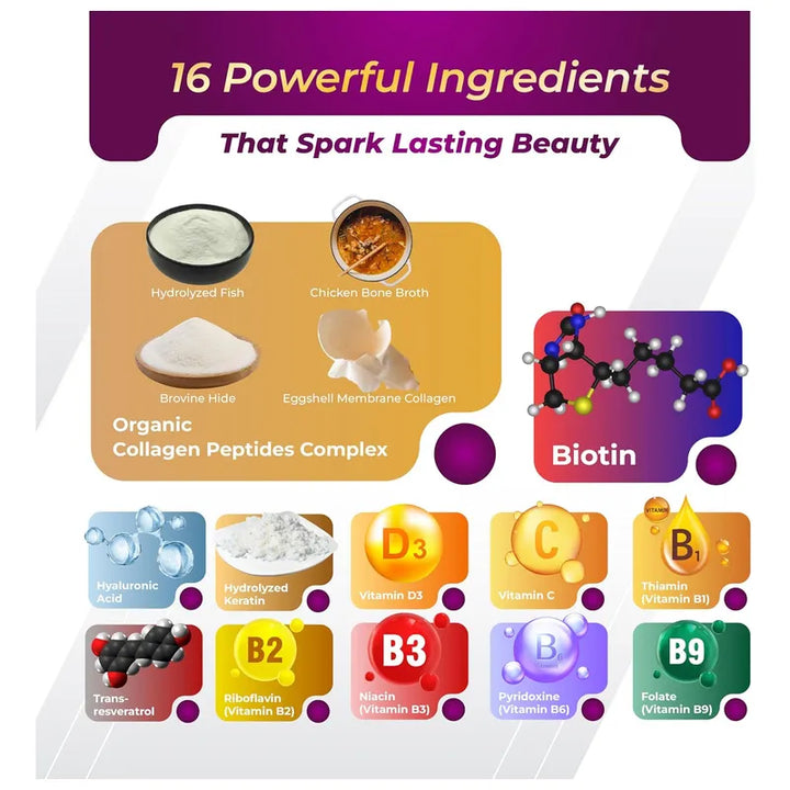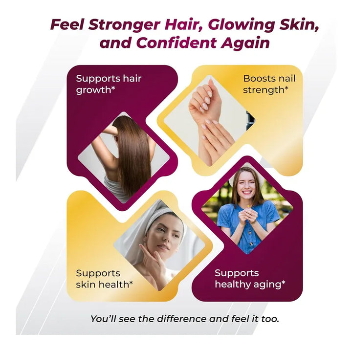 Diseñado para maximizar la absorción, este suplemento funciona divinamente en varias capas de tu bienestar. La biotina refuerza tus uñas y cabello, mientras que los colágenos nutren la piel desde adentro hacia afuera. Combinados con antioxidantes, estos ingredientes combaten el envejecimiento prematuro, ayudándote a mantener un aspecto juvenil.
