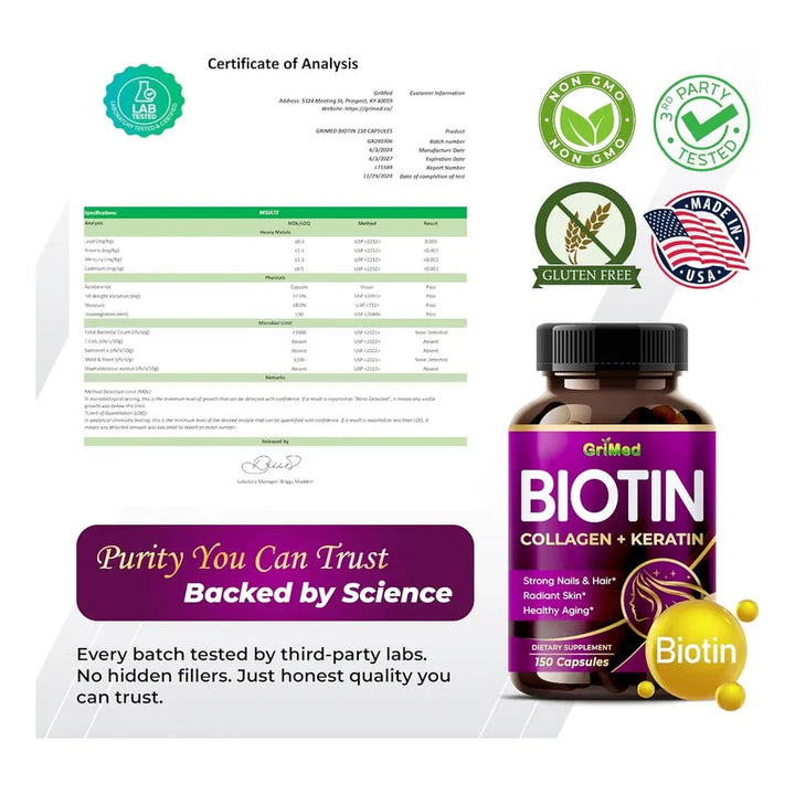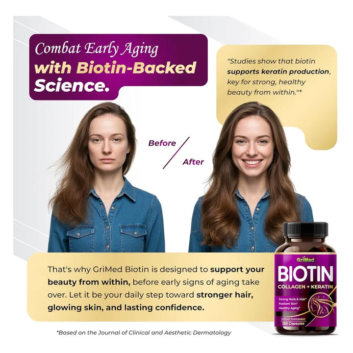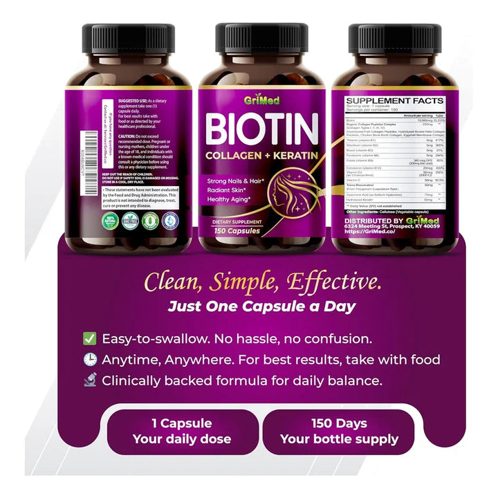 ¿Siempre has soñado con tener uñas fuertes, un cabello exuberante y una piel radiante? Ahora, con las Cápsulas de Biotina, Colágeno y Queratina de GriMed, ese deseo está al alcance de tu mano. Imagina despertar cada mañana sabiendo que tu rutina diaria está fortificada por un suplemento que no solo nutre y fortalece externamente, sino que también promueve un bienestar interno excelente. Es hora de que tu piel, cabello y uñas hablen por sí mismos, mostrando vitalidad sin igual.