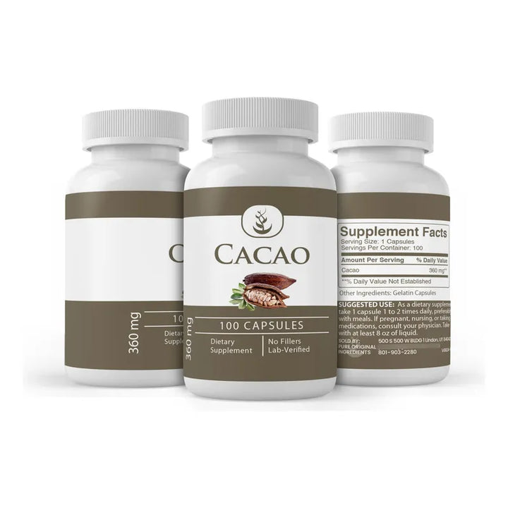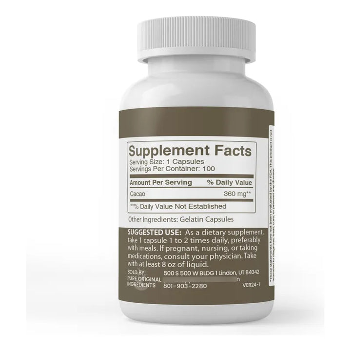 Descubre el poder del cacao puro en cada cápsula y transforma tu rutina de bienestar. ¿Te preocupa la cantidad de aditivos y rellenos en los suplementos habituales? Nuestra solución está diseñada pensando en ti, ofreciendo un producto que respecta tu salud y te brinda lo mejor del cacao, 100% puro.