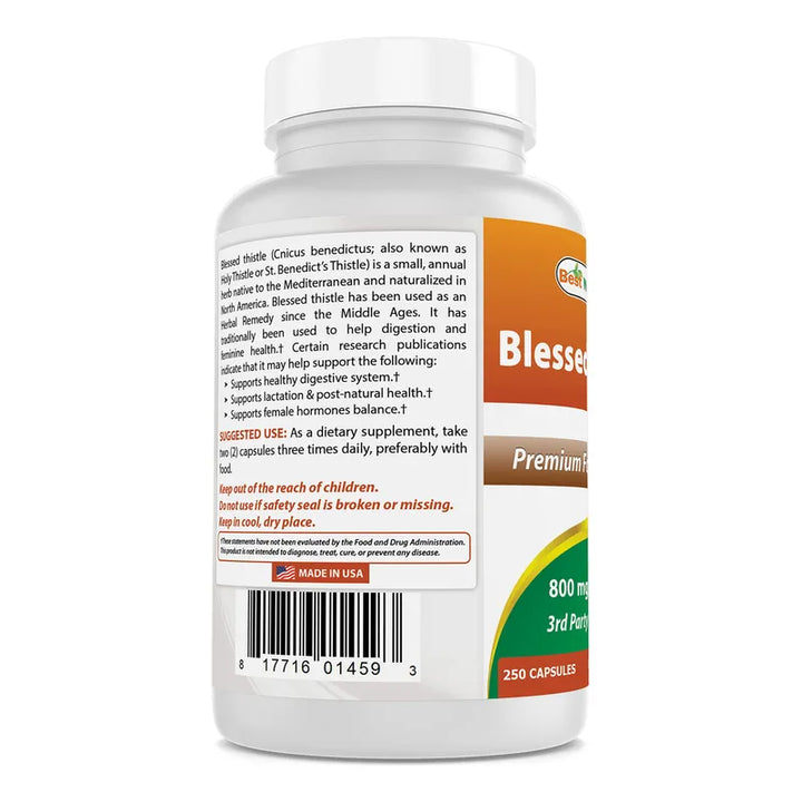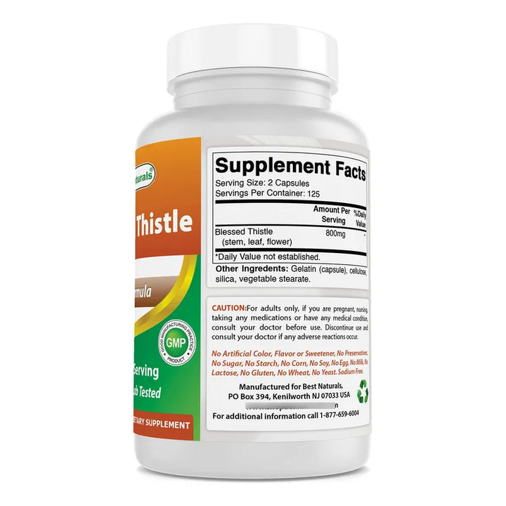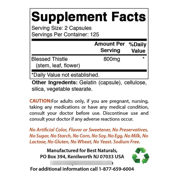 Estas cápsulas de Cardo Bendito son tu aliado perfecto para lograr una lactancia efectiva. Obtén una pureza y calidad excepcionales con cada porción de 800 mg, provista por 250 cápsulas en cada botella. 🌿 Producido en instalaciones registradas por la FDA y siguiendo las buenas prácticas de manufactura, este producto es sinónimo de cuidado y seguridad.