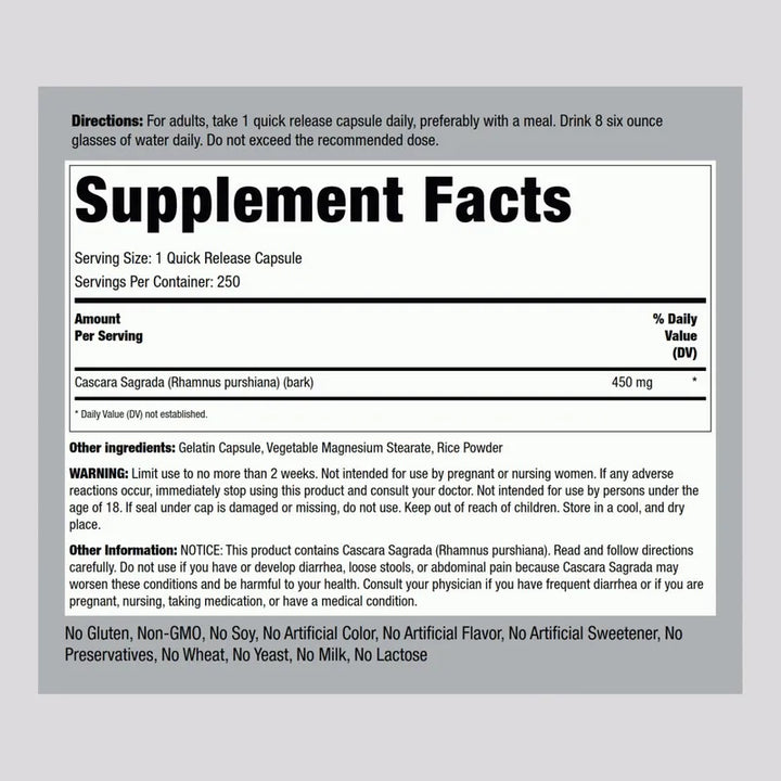 Cápsulas De Cáscara Sagrada 450 Mg Sin Gluten Suplemento Natural