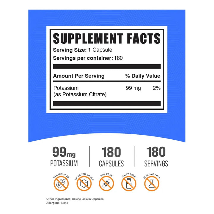 Incorpora fácilmente a tu rutina diaria estas cápsulas diseñadas para proporcionarte el equilibrio perfecto de minerales esenciales que tu cuerpo necesita. Con 99 mg de potasio por cápsula, estarás invirtiendo en tu bienestar con un producto avalado por rigurosos estándares de calidad.