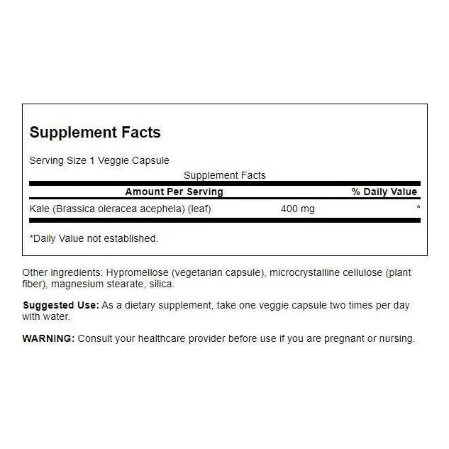 Con 400 miligramos de pureza en cada cápsula, te ofrecemos una forma sencilla y eficaz de añadir kale a tu dieta sin el esfuerzo de preparación y cocinado.