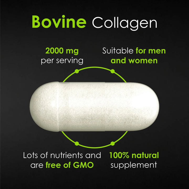 Cada cápsula contiene una dosis potente de 2000 mg de péptidos de colágeno bovino hidrolizado, derivado de fuentes 100% naturales y libres de OMG. Este suplemento no solo apoya la salud de tus articulaciones y huesos, sino que también revitaliza tu piel, cabello y uñas desde adentro. Imagina despertar cada día con menos molestias, más energía y una piel que refleja tu vitalidad.