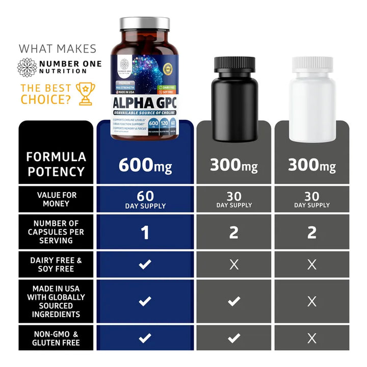 El Alpha GPC es la forma de colina más biodisponible, lo que significa que se absorbe rápidamente, proporcionando nutrientes justo donde se necesitan: en tu cerebro. Sentirás la diferencia desde la primera semana. No hay compromisos: hecho sin gluten, soja, ni colores o sabores artificiales, este suplemento vegetal respeta su cuerpo.