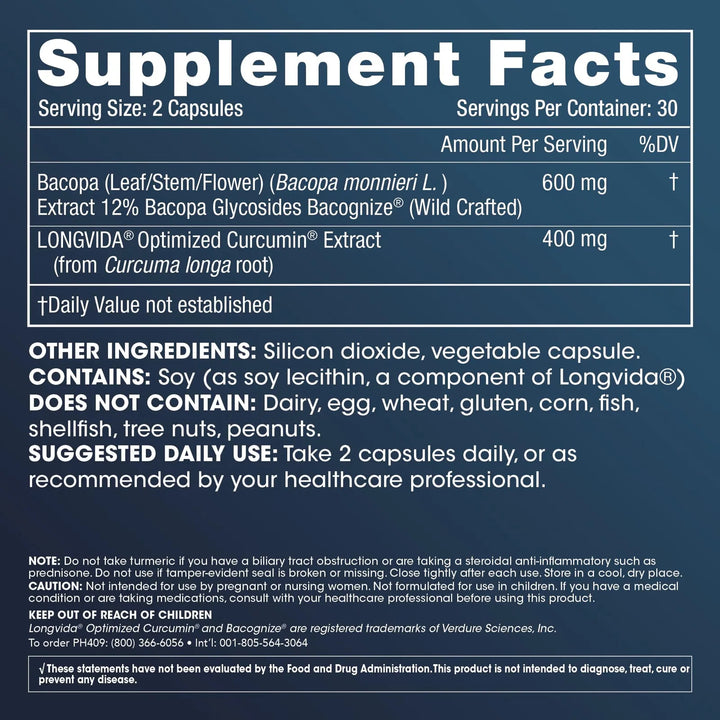 La fórmula avanzada penetra la barrera hematoencefálica para actuar directamente en las áreas cognitivas. La curcumina reduce la inflamación neuronal mientras que la Bacopa estimula la neurogénesis. Instrucciones: Toma 2 cápsulas al día con agua. Para mejores resultados, úsalo consistentemente durante 30 días.