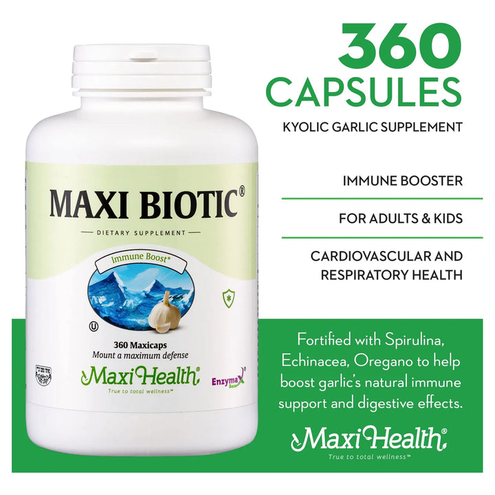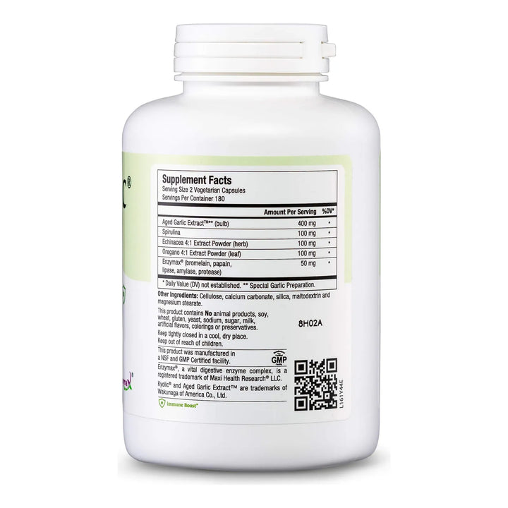 El ajo envejecido en estas cápsulas pasa por un proceso especial que aumenta sus compuestos beneficiosos, como la alicina, conocida por sus propiedades antioxidantes y de apoyo inmunológico. Al combinarse con espirulina, equinácea y orégano, se potencia su efecto desintoxicante y antiinflamatorio, mientras que la mezcla de enzimas digestivas (Enzymax) asegura una mejor absorción de nutrientes y salud intestinal.