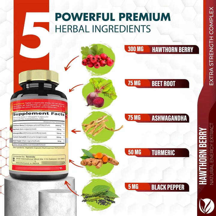 Nuestra fórmula 5 en 1 combina magistralmente los beneficios de la baya de espino, raíz de remolacha, ashwagandha, cúrcuma y pimienta negra. Esta mezcla no solo apoya tu sistema inmunológico, sino que también promueve la salud del corazón, mejora el estado de ánimo y aumenta la energía. Estás frente a una solución holística que abarca todos los aspectos cruciales de tu bienestar. 🌿