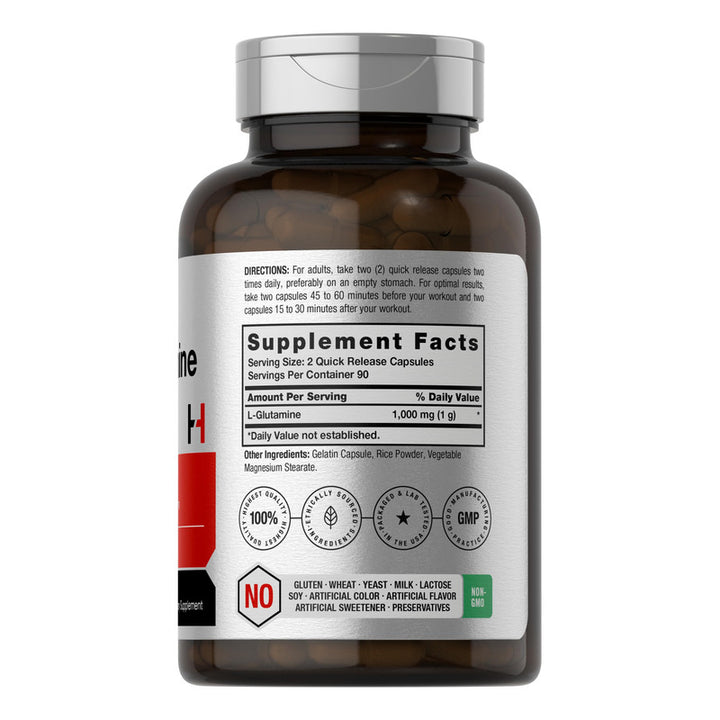 La glutamina es el aminoácido más abundante en tu cuerpo, esencial para la recuperación muscular y el fortalecimiento del sistema inmunológico. Con 180 cápsulas de liberación rápida, este producto te brinda 1,000 mg de L-glutamina por porción, ideal para consumir antes y después de tus entrenamientos. ¿Te preocupa la calidad? No hay problema. Este suplemento está elaborado por expertos, probado en laboratorio y es 100% libre de OMG, gluten, lactosa y conservantes artificiales.