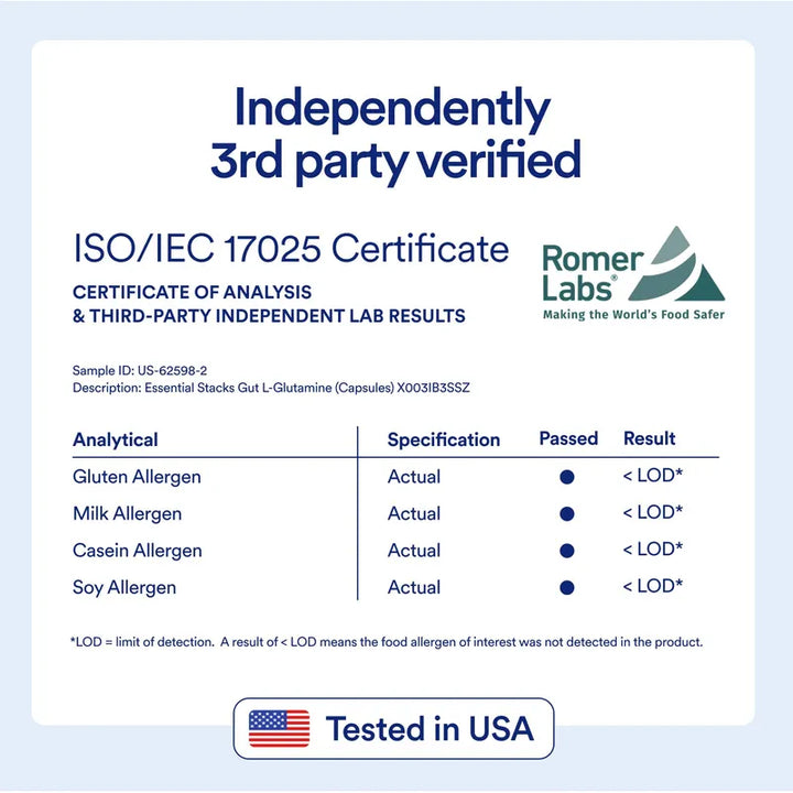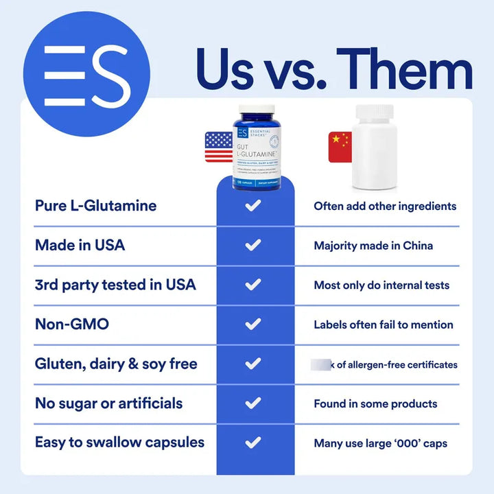 ¿Cansado de productos que prometen mucho y entregan poco? Nuestras cápsulas de L-Glutamina están fabricadas con los más estrictos estándares en EE. UU., asegurando una experiencia que supera a las competidoras que utilizan ingredientes de China. Sin contener alérgenos comunes como gluten, lácteos o soja, este suplemento es la opción ideal para quienes buscan calidad y tranquilidad.