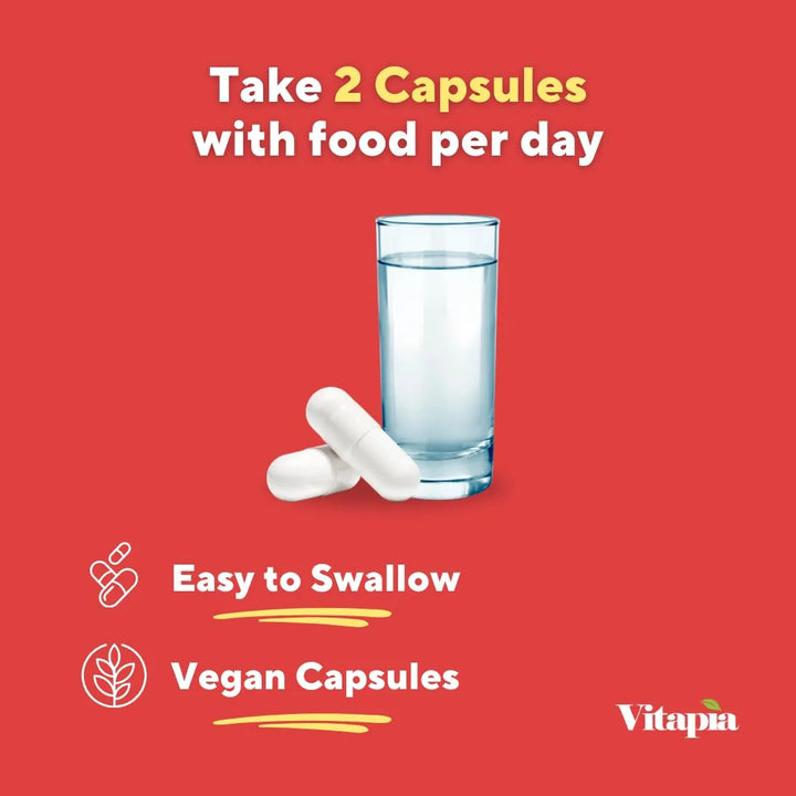 - Toma 2 cápsulas al día, preferiblemente antes de las comidas principales.