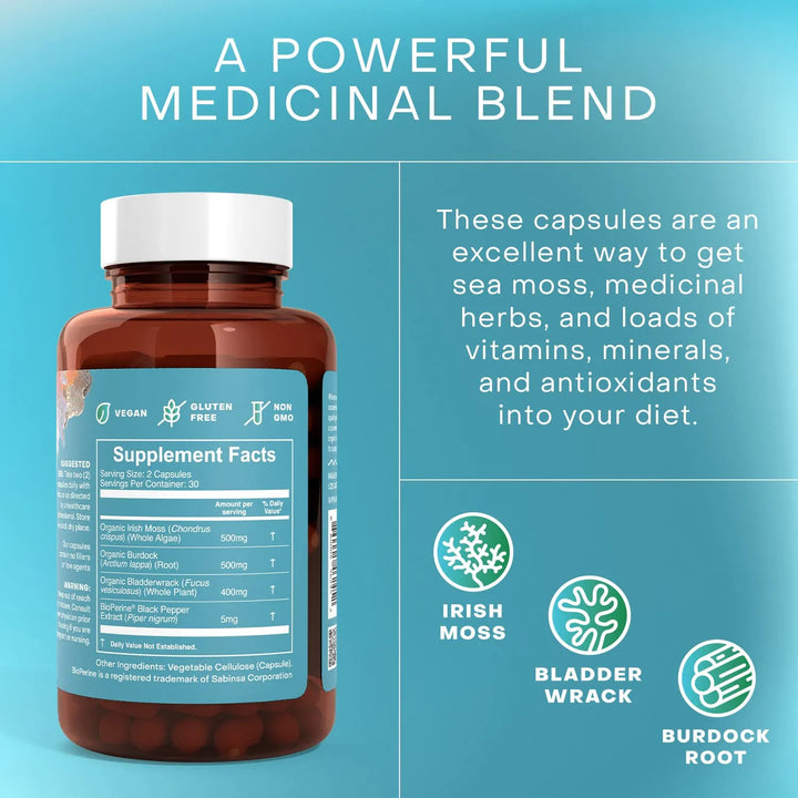 El musgo marino actúa como un superalimento, proporcionando más de 90 minerales esenciales que el cuerpo necesita para funcionar óptimamente. Al combinarse con la raíz de bardana y la BioPerine, se potencia su absorción, permitiendo que nutrientes como el yodo (clave para la tiroides) y los antioxidantes trabajen sinérgicamente. Esto se traduce en mejor digestión, piel más luminosa y un sistema inmunológico fortalecido.