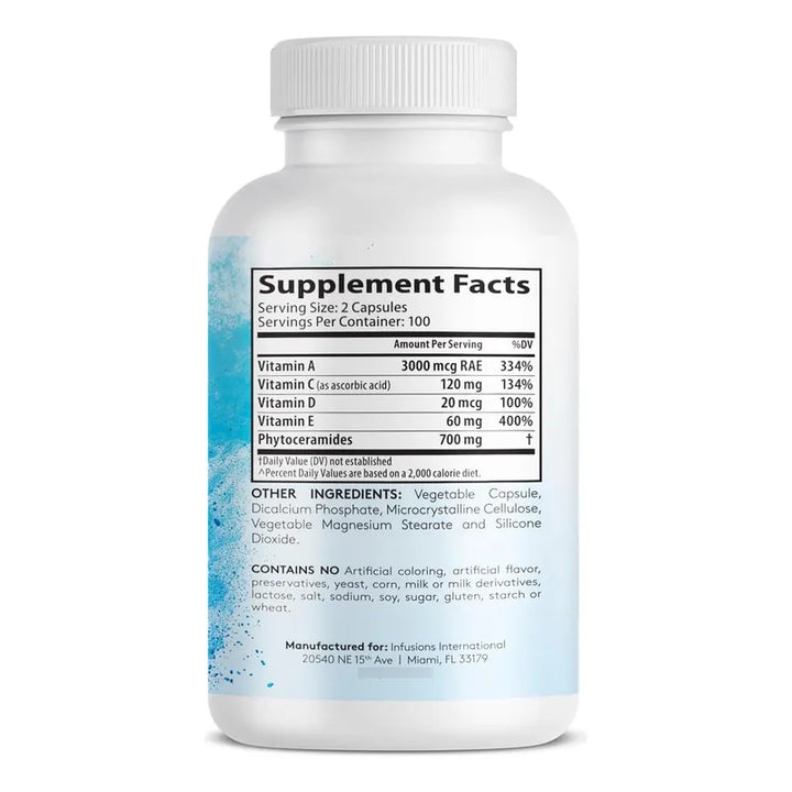 Imagina poder reducir los signos del envejecimiento sin complicaciones ni tratamientos costosos. Nuestra fórmula única con 700mg de ceramidas derivadas de plantas te brinda un apoyo nutritivo excepcional. Están libres de gluten y OMG, ofreciendo seguridad y calidad en cada cápsula.