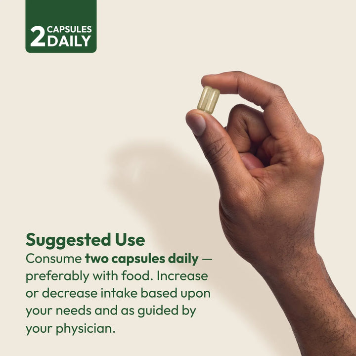 - Toma 1 o 2 cápsulas al día, preferiblemente con un vaso grande de agua.