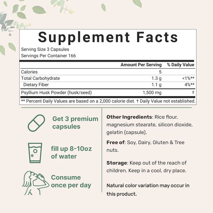 La cáscara de psyllium es conocida por su potente efecto como prebiótico y probiótico natural. Con cada cápsula de 1,500 mg, ayudas a mantener tu sistema digestivo limpio y saludable, promoviendo movimientos intestinales regulares y manejando el control del hambre.
