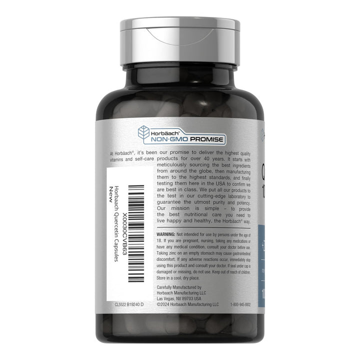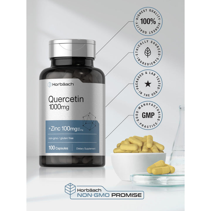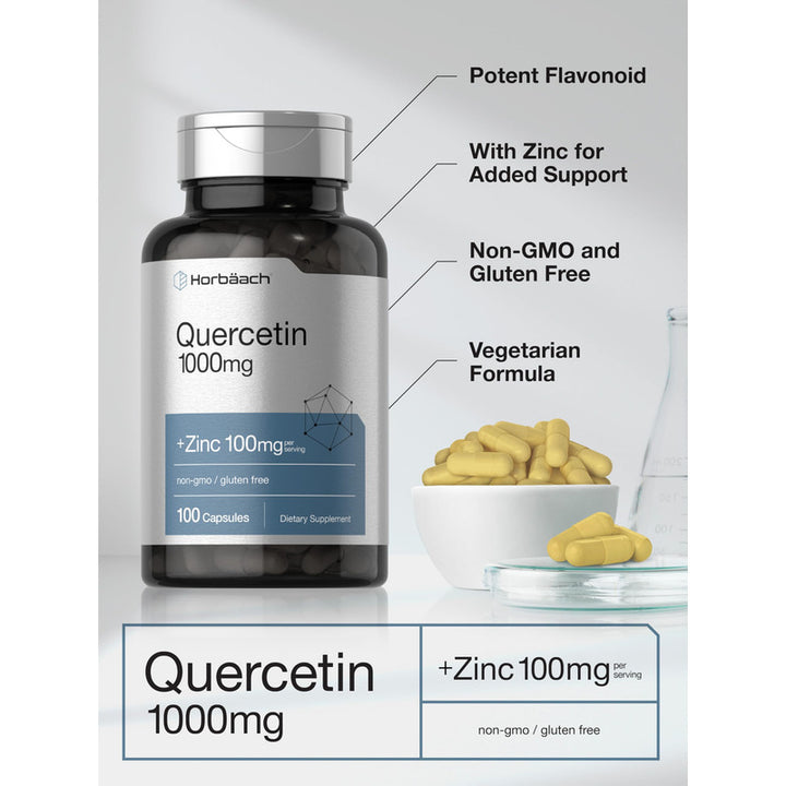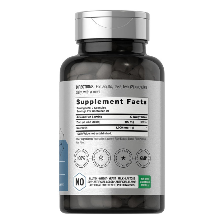 Desde el primer momento, sentirás el cálido abrazo de un suplemento elaborado por expertos y probado en laboratorio. Cada cápsula contiene 1,000 mg de quercetina y 100 mg de zinc, una fórmula de alta potencia diseñada para maximizar sus efectos. Este producto está cuidadosamente elaborado, respaldado por un compromiso incuestionable con la pureza y potencia de sus ingredientes.