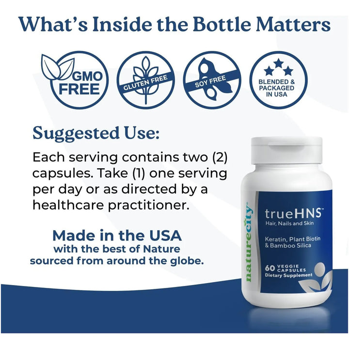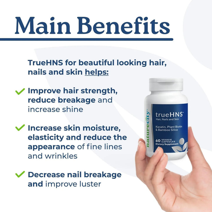 Cada cápsula de TrueHNS contiene Cynatine HNS, una proteína de queratina solubilizada que tu cuerpo absorbe fácilmente, fortaleciendo el cabello, reduciendo las arrugas y mejorando la elasticidad de la piel. Imagina despertar cada día con un brillo natural que nace de una nutrición real, sin químicos agresivos ni ingredientes sintéticos. Este no es otro suplemento más: es el resultado de 22 años de investigación científica combinada con lo mejor de la naturaleza.