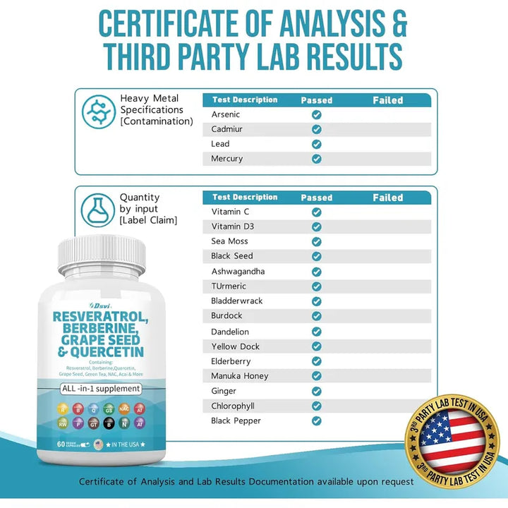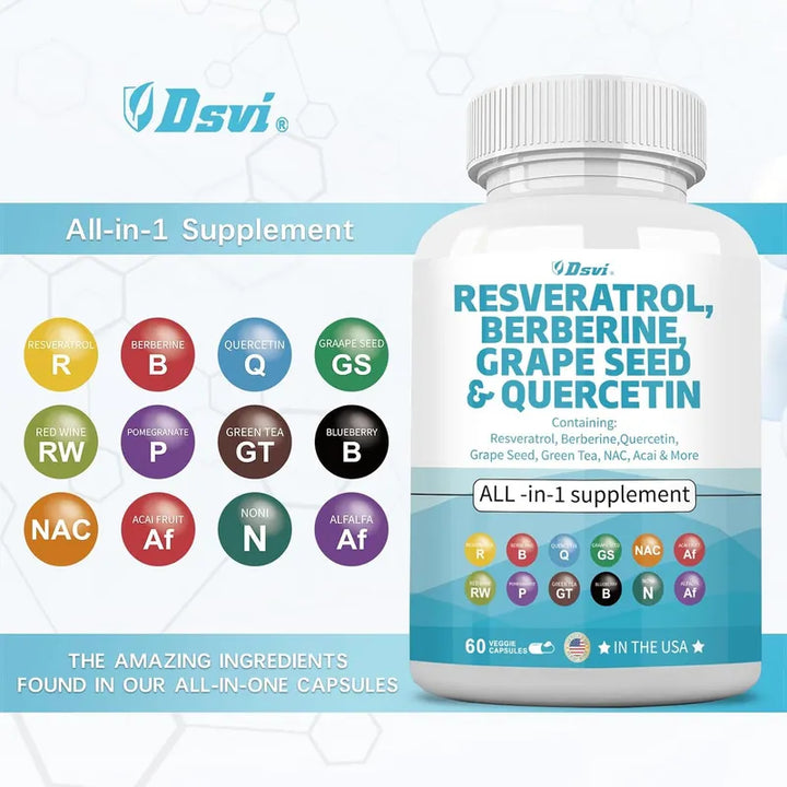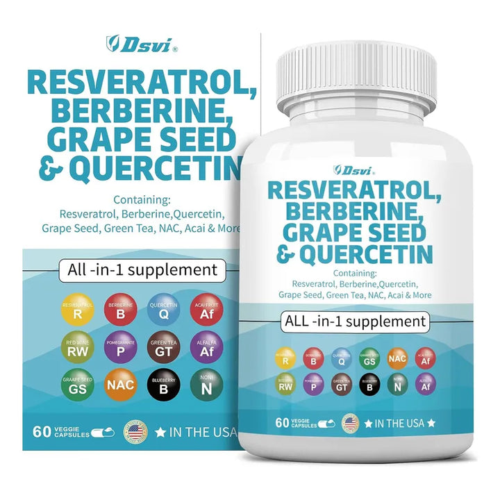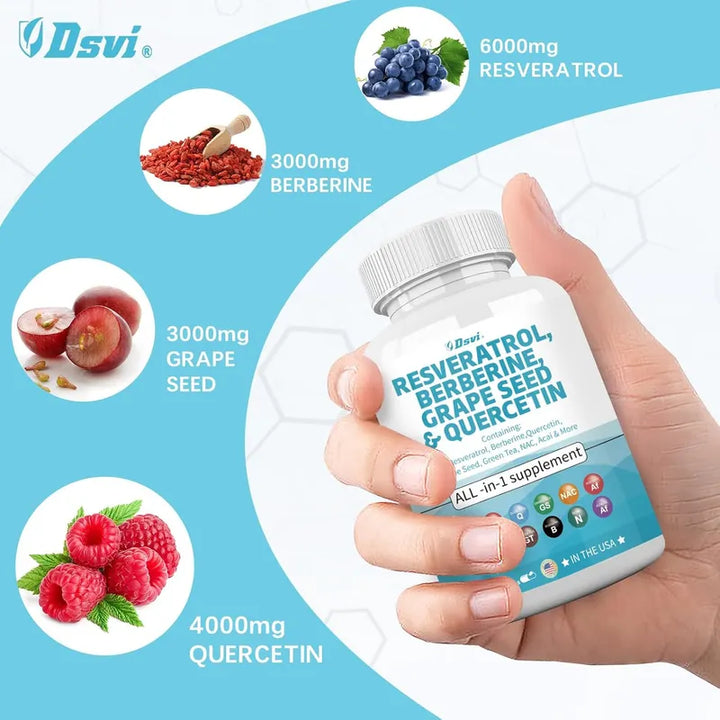 Cada cápsula está repleta de ingredientes de la más alta calidad, cuidadosamente seleccionados para proporcionar hasta 6000 mg de Resveratrol, 3000 mg de Berberina y mucho más, todos extraídos de fuentes naturales y potentes. Estos suplementos convencionales no se comparan con nuestro potente complejo de bienestar, que combina no solo resveratrol y berberina, sino también quercetina, extracto de semilla de uva y extractos de superfrutas como acai y granada.