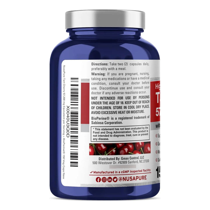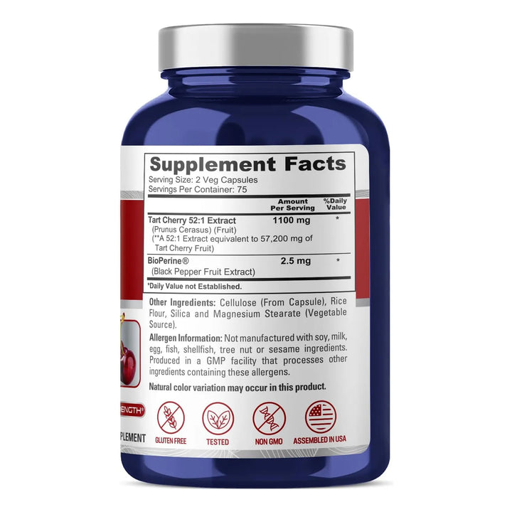 Imagina tener a tu alcance todo el beneficio de la cereza ácida, concentrado en una cápsula fácil de tomar. Nuestras cápsulas de tarta de cereza de 57,200 mg son la solución perfecta para quienes buscan un suplemento vegano, sin OMG y sin gluten, diseñado para ofrecer máxima absorción gracias a su fórmula con Bioperine. Cada cápsula equivale a un extracto 52:1, lo que significa que estás obteniendo lo mejor de la naturaleza en su forma más pura y potente.