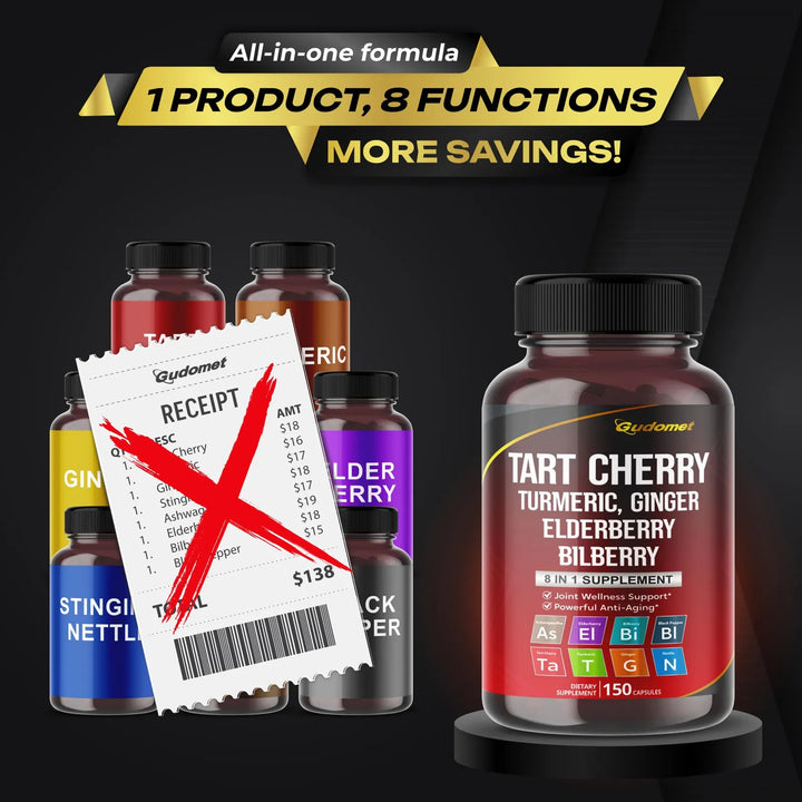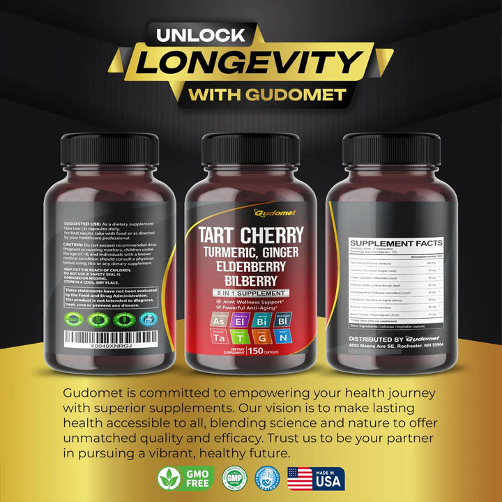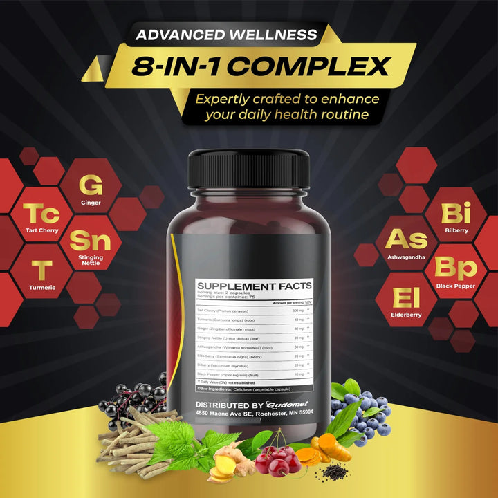 La combinación única de cereza ácida, cúrcuma y jengibre actúa sinérgicamente para reducir la inflamación y mejorar la movilidad articular. La ashwagandha regula el estrés y promueve un sueño profundo, mientras que el saúco y el arándano fortalecen tus defensas. La pimienta negra, por su parte, aumenta la biodisponibilidad de los ingredientes, asegurando que tu cuerpo absorba todos sus beneficios.