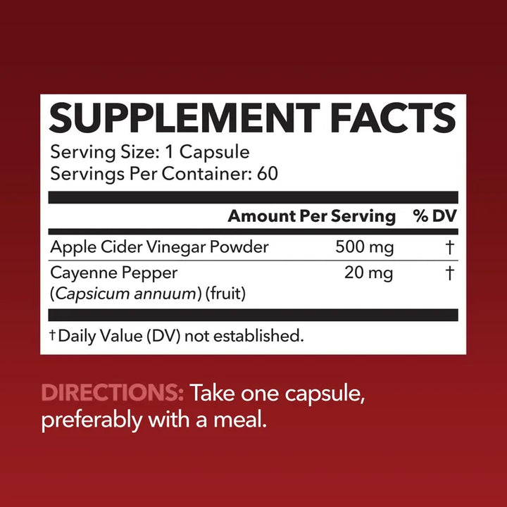 - 500 mg de vinagre de sidra de manzana combinado con 20 mg de pimienta de cayena. 🌶️