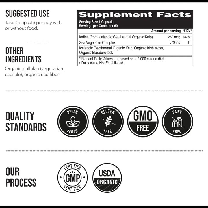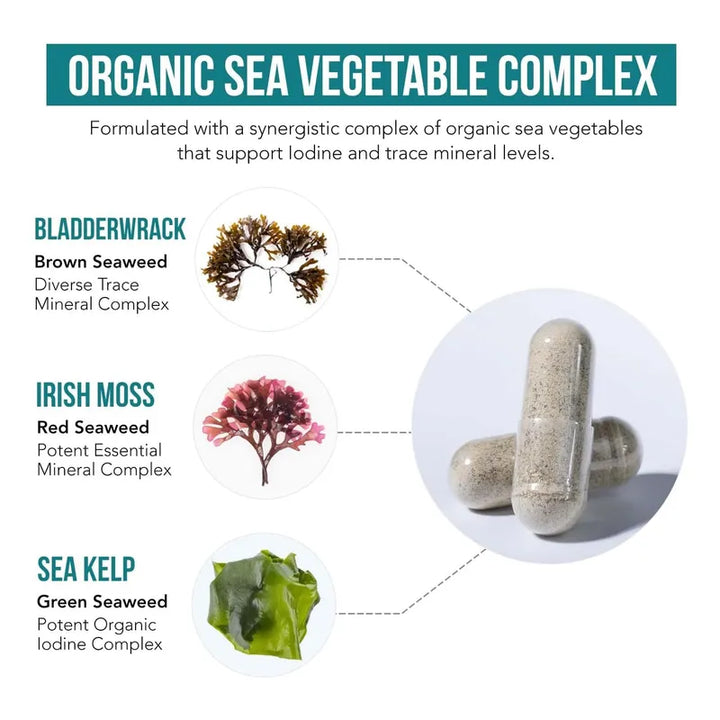 Estos vegetales marinos cuidadosamente seleccionados ofrecen un complejo de nutrientes que trabaja de la mano para llevarte hacia una salud óptima. Con minerales, vitaminas y aminoácidos esenciales, estas cápsulas van más allá de lo convencional, proporcionando un soporte crucial para tu tiroides y metabolismo.