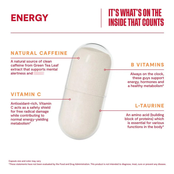Las Cápsulas Energéticas trabajan sinérgicamente a través de una fórmula que combina cafeína natural y vitaminas esenciales. La cafeína brinda estímulo para mantenerte alerta y enfocado, mientras que las vitaminas B y C refuerzan la producción de energía al estabilizar tu metabolismo y mejorar tu rendimiento físico. Esta combinación asegura que experimentes resultados que puedas sentir.