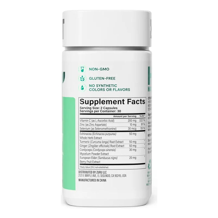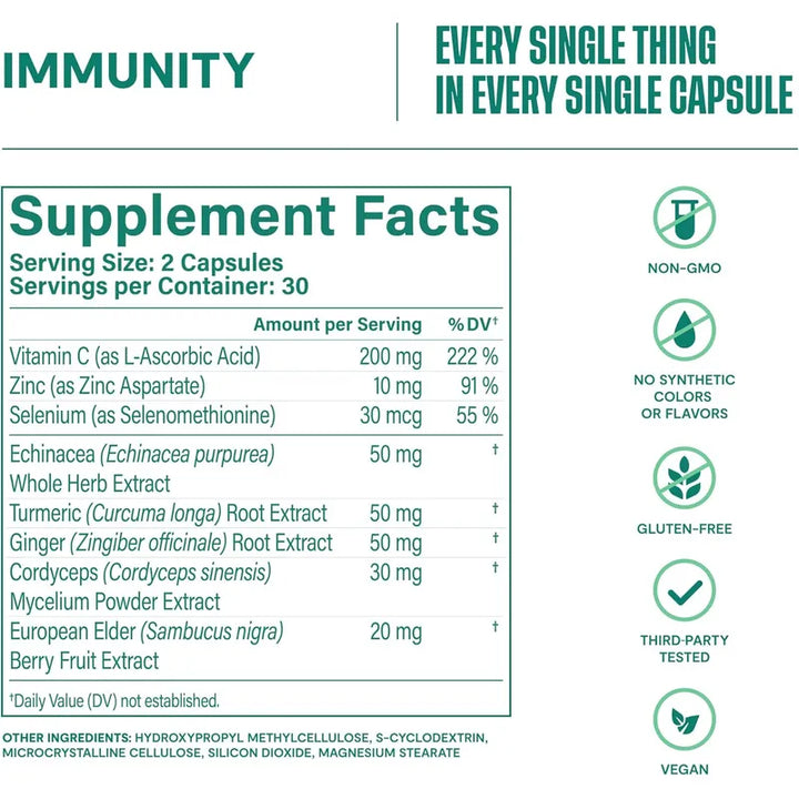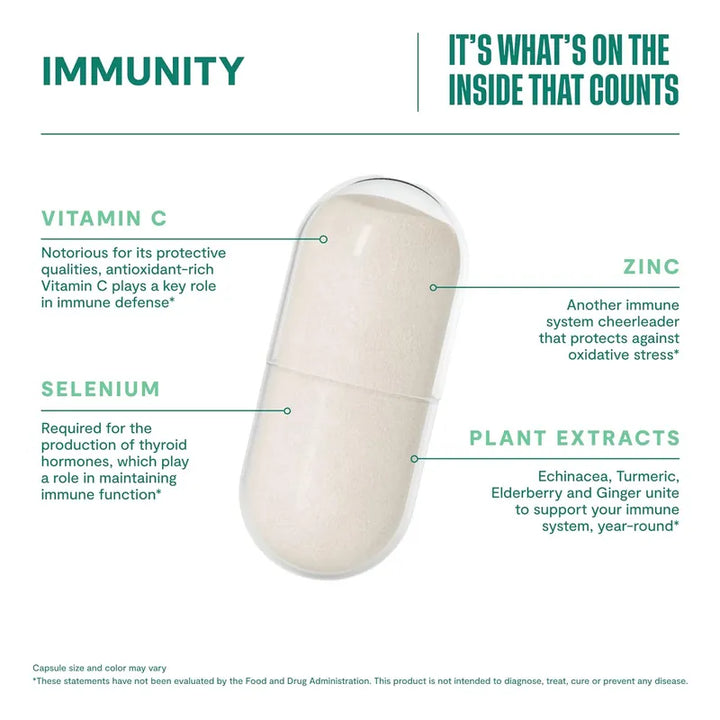 Nuestras cápsulas están cargadas de ingredientes naturales como vitamina C, equinácea, cúrcuma y saúco que juntos elevan tus niveles de antioxidantes, proporcionando una barrera protectora efectiva para tu cuerpo. Además, cada cápsula es vegana, libre de ingredientes transgénicos, colores y sabores sintéticos, lo que significa que solo estás recibiendo lo mejor de la naturaleza.