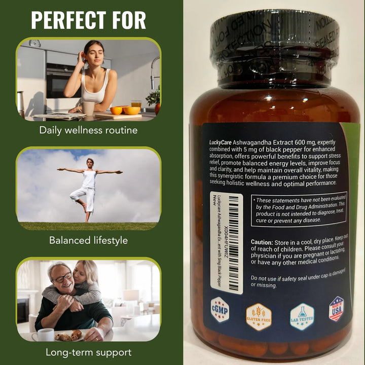 Cada cápsula contiene 600 mg de extracto puro de raíz de ashwagandha, combinado con 5 mg de extracto de pimienta negra para maximizar su absorción. ¿Por qué conformarte con menos cuando puedes tener lo mejor? Nuestro producto está fabricado en Estados Unidos, en instalaciones de última generación que garantizan pureza, potencia y calidad en cada dosis. Sin rellenos artificiales, sin conservantes dañinos, solo ingredientes limpios y efectivos que tu cuerpo merece.