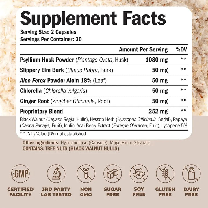 Nuestra fórmula única no solo incluye cáscara de psyllium, sino también una mezcla de ingredientes seleccionados específicamente para promover la salud intestinal. El jengibre aporta bienestar general, mientras que la chlorella y la corteza de olmo resbaladiza brindan un soporte adicional para neutralizar los radicales libres y maximizar la comodidad digestiva. 🧘♂️