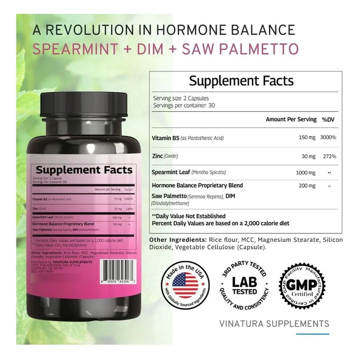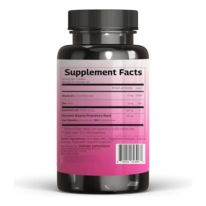 Descubre cómo una fórmula científica de 1380 mg por porción transforma el equilibrio hormonal cotidiano. Cada componente ha sido meticulosamente seleccionado: Menta Verde, DIM, Saw Palmetto, Zinc y Vitamina B5, crean la sinergia perfecta para ayudarte a mantener un cuerpo y una piel saludables. No es solo increíblemente potente, es la dosis más fuerte disponible para mujeres que buscan equilibrio de forma proactiva.