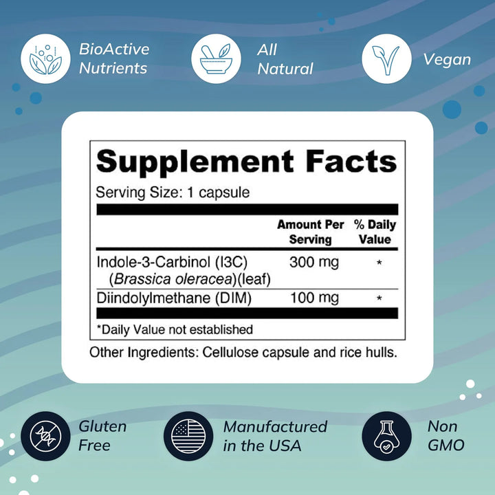Potencia Clínicamente Validada: 300 mg de I3C + 100 mg de DIM por cápsula, la dosis óptima para resultados visibles. 🔬