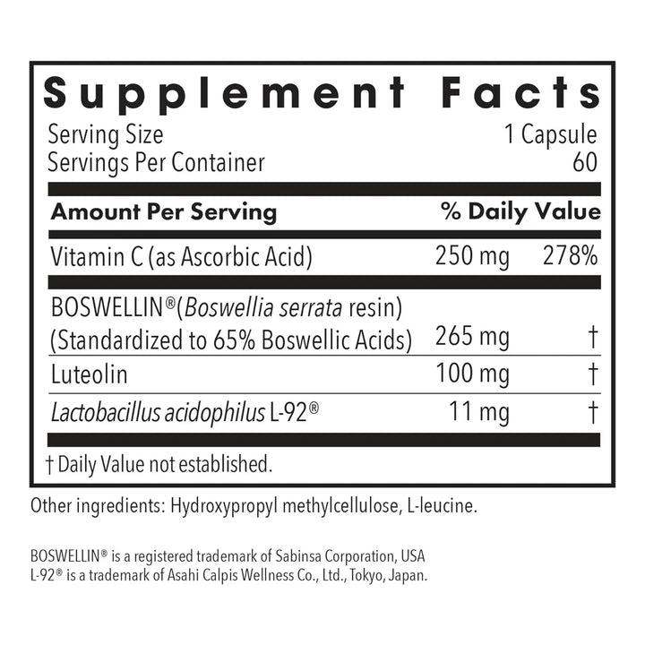 El Lactobacillus Acidophilus L-92 coloniza tu intestino, fortaleciendo tu microbiota y modulando la respuesta inmunitaria. Esto reduce la hipersensibilidad a alérgenos comunes, como el polen. Simultáneamente, el ácido boswélico (de la boswellia) actúa como antiinflamatorio natural, despejando las vías respiratorias y reduciendo la congestión. El incienso indio completa la fórmula con sus propiedades adaptogénicas, ayudando a tu cuerpo a manejar mejor el estrés ambiental.