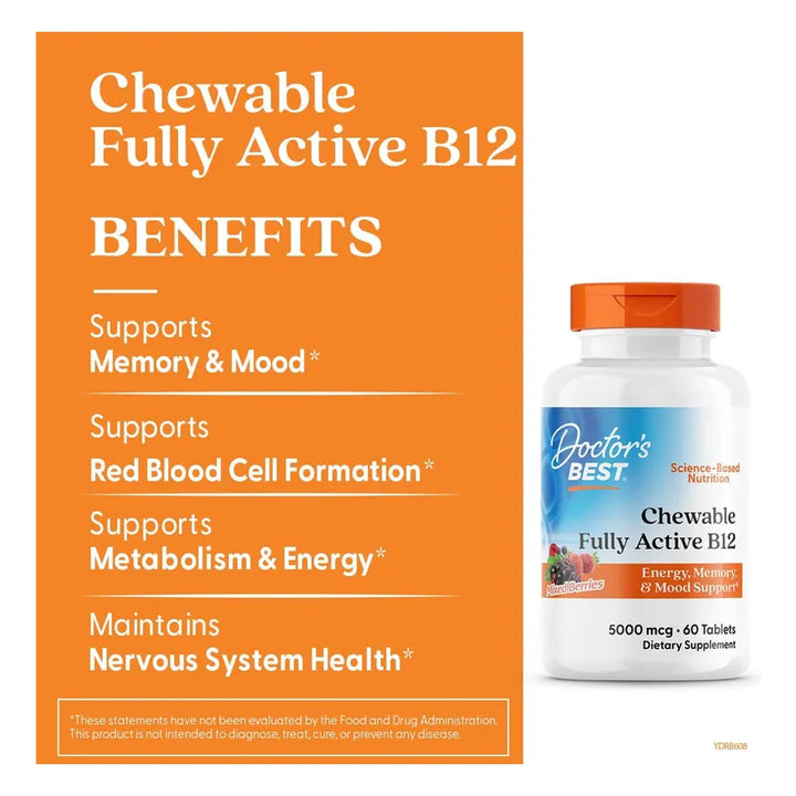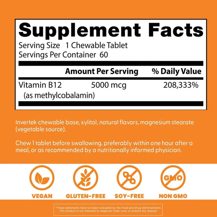 Imagina tener la vitalidad necesaria para enfrentar cualquier desafío. Nuestra fórmula masticable y deliciosa está diseñada no solo para deleitar tu paladar, sino también para proporcionarte la metilcobalamina, una forma de vitamina B12 que es crucial en la producción de energía. Experimenta la claridad mental y el bienestar que mereces sin comprometer tu estilo de vida vegano o tus restricciones alimentarias.