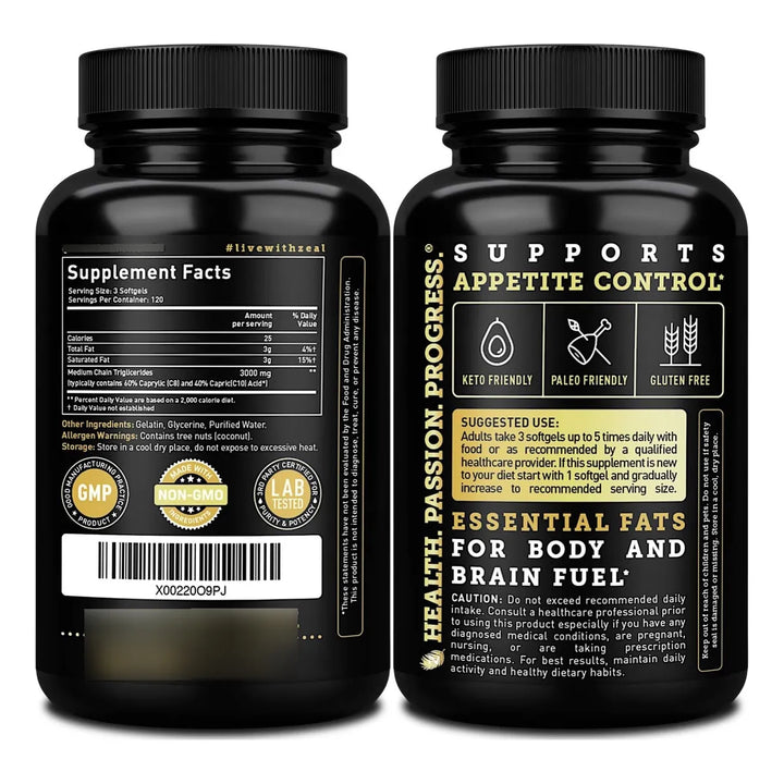 - 🔥 Energía instantánea: Con 3000 mg de triglicéridos de cadena media (MCT) por cápsula, tu cuerpo obtiene combustible rápido y eficiente.
