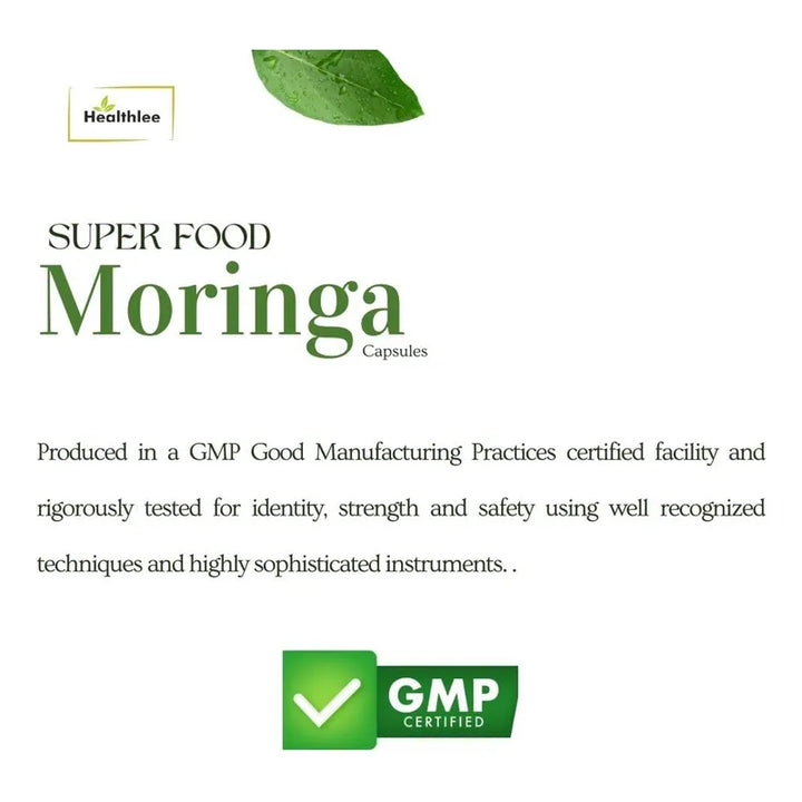 Ahora, más que nunca, es fácil elegir lo mejor para ti. Al confiar en nuestras cápsulas de Moringa, te aseguras un producto rigurosamente testado para identidad, fuerza y seguridad, gracias a su producción en instalaciones certificadas por GMP. Cada día que lo incorporas a tu dieta estás invirtiendo en un bienestar respaldado por prácticas de manufactura de excelencia.